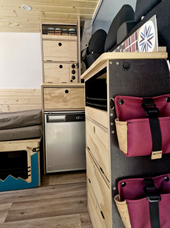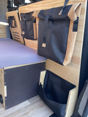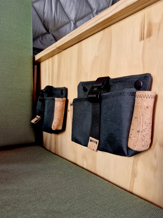 Kinakis són bosses d’emmagatzematge lleugeres, impermeables i fàcils d’instal·lar, dissenyades per aprofitar millor l’espai de la furgo. Estan fetes amb una combinació de tela resistent i suro natural, materials lleugers i duradors que aporten funcionalitat, estil i un clar caràcter artesanal.